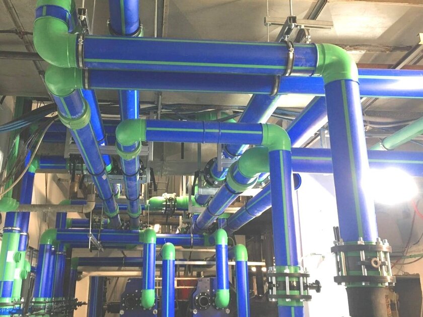 Products from aquatherm were used for the piping of the system. Key to their selection were the reduced thermal conductivity of the material polypropylene and the low pipe roughness, which remains unchanged even after long use. The special material properties also ensure that no corrosion occurs even after many years of operation. The fibre-reinforced pipe system aquatherm blue was used in sizes between 20 and 250 mm outer diameter, fibre-reinforced aquatherm green up to 200 mm as well as prefabricated elements