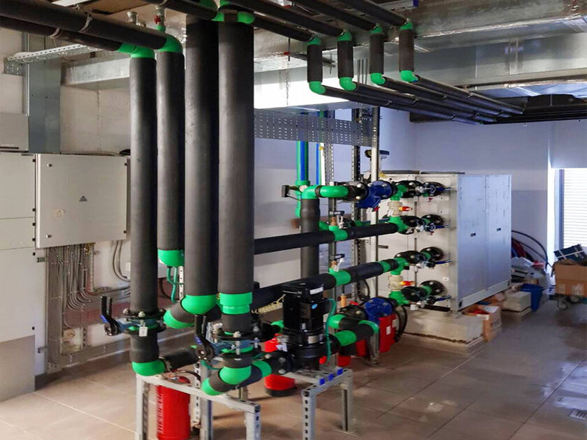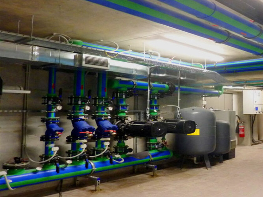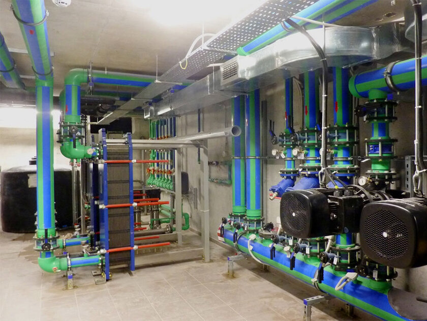 The complete piping of the heating and cooling circuits in the building including the connection to the geothermal system and the heat exchangers was realized with aquatherm blue and aquatherm green.