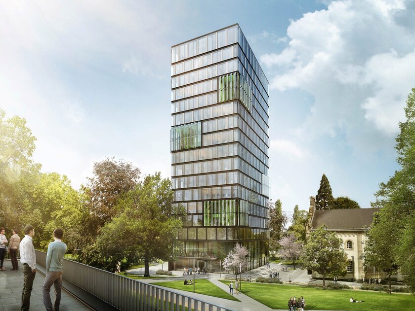 In order to create space for future growth, the Federal Real Estate Agency (Bundesanstalt für Immobilienaufgaben), the owner of the campus that forms the centre of the United Nations organisations in Bonn, had decided to build the new building. Under the direction of the Federal Office for Building and Regional Planning (BBR), a slender high-rise building with 17 upper floors and 3 basement floors was constructed on a footprint of approximately 20 x 30 metres; the 18th floor is a staggered floor that serves the building services. The total costs amount to about 75 million euros. Due to its relatively small footprint, the building, designed by Berlin architect Stefan Lippert, blends in with the existing buildings and encroaches as little as possible on the surrounding green area of the campus. A highlight is the glass outer skin of the office tower, which is interrupted by two-storey conservatories. These provide a connection to the surrounding green space and are used by approximately 330 employees as a place to meet and relax during breaks.