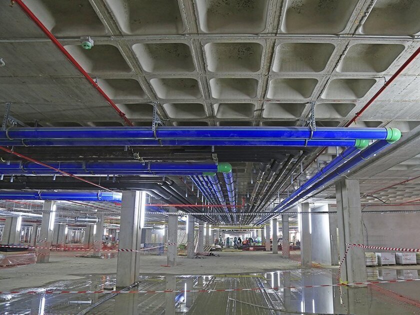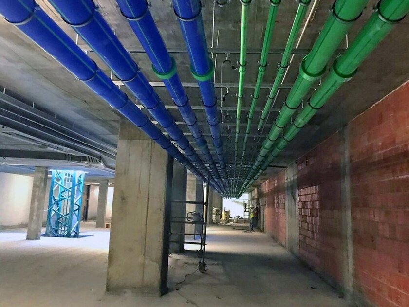 Para las tuberías de los fan coils, que se utilizan en todo el edificio para la climatización, los proyectistas se decidieron por aquatherm blue. Se utilizaron unos doce kilómetros de tuberías para garantizar el buen funcionamiento del sistema de aire acondicionado durante muchas décadas.