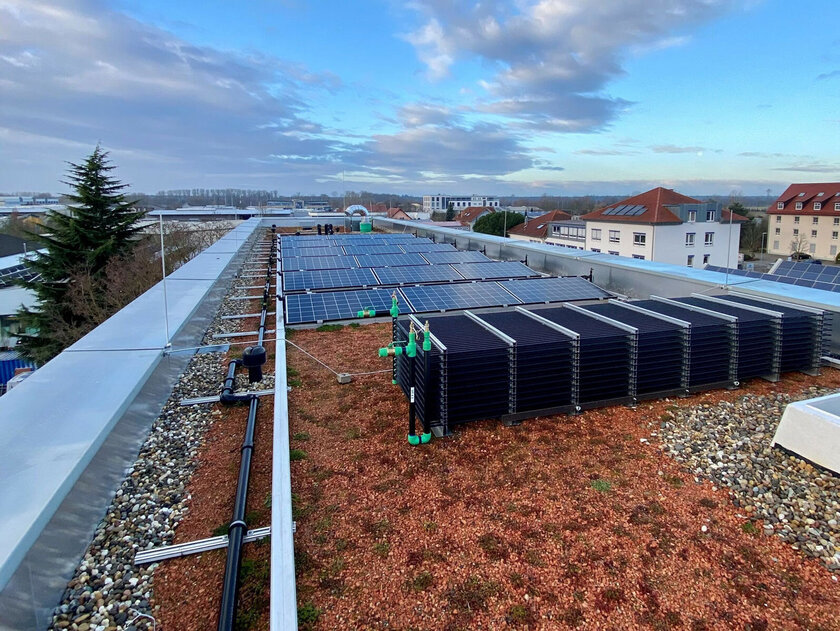 La combinación de los dos sistemas - superficies absorbentes con aquatherm black y el sistema fotovoltaico - se denomina tejado energético. "De este modo se aprovecha doblemente la superficie disponible de la cubierta y se aumenta considerablemente la eficiencia de todos los sistemas existentes", explica Mathias Hahn, director comercial de Metternich Haustechnik GmbH. "Los efectos sinérgicos resultantes se expresan en los extraordinarios valores COP del sistema de almacenamiento de energía de hielo".