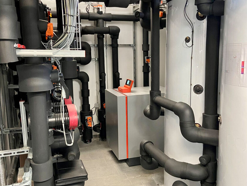 Además del sistema aquatherm black, en la sede de la empresa dekoGraphics se utilizaron otros productos de aquatherm: aquatherm blue se utilizó para toda la tecnología de calefacción, incluida la conexión del acumulador de energía de hielo, la bomba de calor, el sistema cargador y el techo eléctrico. El sistema de tuberías se caracteriza por su alta resistencia a la temperatura y a la presión. A esto se añaden las excepcionales propiedades de soldadura y la fusión en una unidad homogénea y materialmente cohesiva, por lo que se consigue un máximo de seguridad y vida útil. Para garantizar la distribución de agua potable en el edificio, se instaló aquatherm green. El sistema de tuberías, higiénicamente perfecto, inodoro e insípido, garantiza la conservación de la calidad del agua potable. Las tuberías del sistema aquatherm green no sólo son resistentes a la corrosión, sino también fisiológica y microbiológicamente inocuas, y han demostrado su idoneidad técnica en décadas de aplicación en todo el mundo.