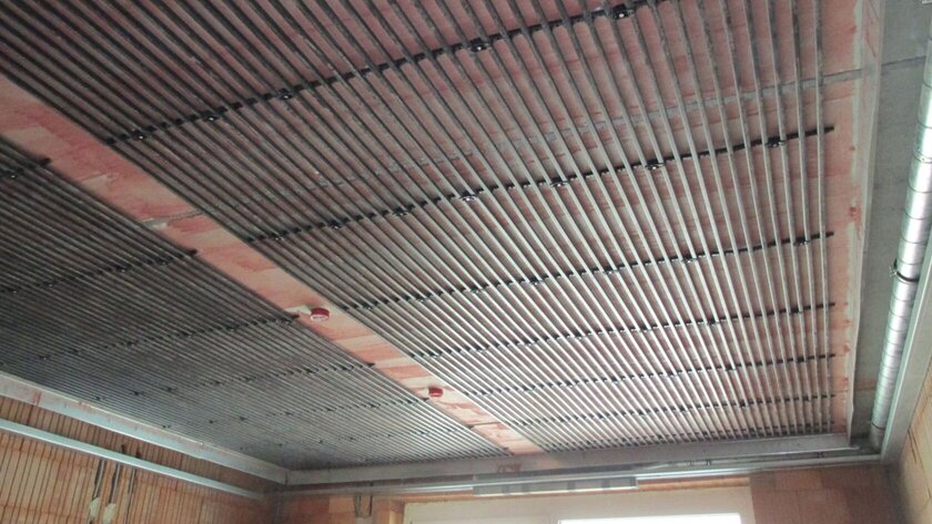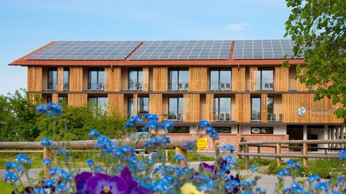 Daher wurden höchstwärmedämmende Baustoffe eingebaut, das Gebäude an eine bestehende Hackschnitzelheizung angeschlossen und eine Photovoltaik-Anlage für hauseigenen Strom installiert. Außerdem setzt das Klimakonzept auf die Verwendung von Erdwärme für Heiz- und Brauchwasser sowie auf die Anreicherung einer zentralen Lüftungsanlage mit Wärmerückgewinnung. Zusätzlich erfolgte eine Bauteilaktivierung der Geschossdecken und Wände, das heißt, die Decken und Wände der einzelnen Gästezimmer können heizen oder kühlen. Somit sorgen sie zu jeder Jahres- und Tageszeit für maximale Behaglichkeit. Möglich macht dies das Flächenheiz- und Kühlsystem aquatherm black, das in den Zimmerdecken und -wänden des Hotels verlegt wurde. Die schwarzen Register aus korrosionsbeständigem Polypropylen geben die Temperatur des durch sie fließenden Wassers mittels Strahlung ab. Zugluft oder Staubaufwirbelungen sind durch diesen Prozess ausgeschlossen und die gefühlte Behaglichkeit im Raum nimmt zu. Das System arbeitet außerdem mit niedrigeren Vorlauftemperaturen als konventionelle Heiz- bzw. höheren Vorlauftemperaturen als andere Kühlsysteme und ermöglicht so einen besonders effizienten und energiesparenden Betrieb.