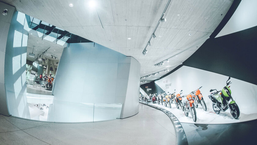 Bereits von außen lässt sich erkennen, dass sich in der KTM Motohall, die nur wenige Schritte vom Gründungsort des Unternehmens entfernt errichtet wurde, alles um den Rennsport dreht – ganz getreu dem Motto „READY TO RACE“: Eine umspannende Metallkonstruktion in Form einer Reifenspur ist das architektonische Ausrufezeichen des ovalen Bauwerkes. Innen werden die Besucher an einer nachgebauten Steilkurve durch die Ausstellung geführt und bewegen sich über Schleifen und Rampen durch das Gebäude. Diese anspruchsvolle Architektur verlangte von der Gebäudetechnik und den verwendeten Produkten ein besonders hohes Maß an Gestaltungsfreiheit.