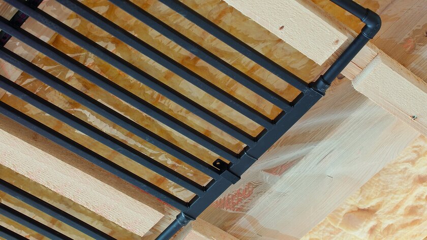 Dank aquatherm black fand die Familie auch eine Lösung für das statische Problem in der ehemaligen Scheune: Statt der nicht möglichen Estrichschicht samt klassischer Fußbodenheizung wurde auf dem alten Fußbodengewölbe neben einer Dämmung ein Boden aus OSB-Verlegeplatten montiert, auf die das Flächenheiz- und Kühlsystem geschraubt wurde.