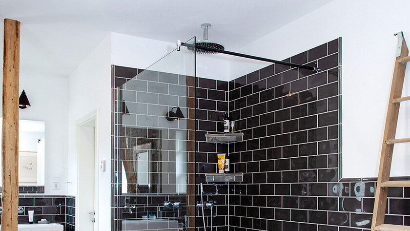Im Badezimmer wurde eine besondere Lösung gewählt: Die schwarzen Register wurden in die Dusche integriert und sorgen so schon beim Betreten der Nasszelle für behagliche Wärme. Die Installation erfolgte an zwei Seiten der Duschwand.