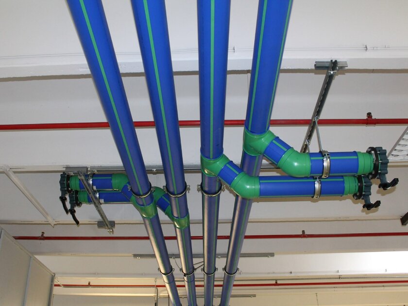 In verschiedenen Gebäudekomplexen kamen insgesamt rund 10.000 Meter des faserverstärkten Rohrleitungssystems aquatherm blue in Dimensionen von 32 bis 450 mm zum Einsatz.