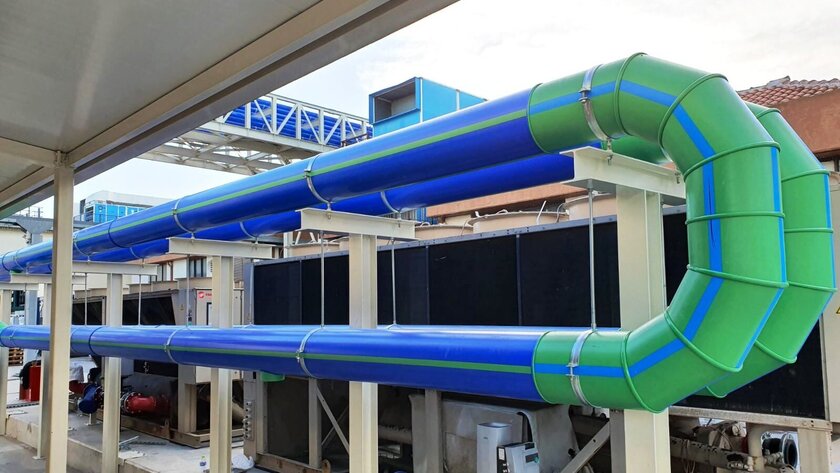 Ike Gerasimos Vasilatos und Alexandra Zaxopoulou von GVA Engineers planten aus diesem Grund eine neue Kälteanlage, in der die Kältemaschinen an eine Primärkreis- und eine Sekundärkreisverteilung angeschlossen wurden. Die gesamte Verrohrung besteht aus aquatherm blue ot. Das korrosionsresistente Rohrleitungssystem aus Polypropylen, das über eine Sauerstoffbarriere verfügt, punktete aufgrund der verringerten Wärmeleitfähigkeit des Materials sowie der sehr geringen Rohrrauigkeit auch nach langem Betrieb, was gleichzeitig den Schutz der Metallteile der Installation und der 25 mm dicken Schaumisolierung gewährleistet. aquatherm blue ot kam in Dimensionen zwischen 50 und 250 mm zum Einsatz, zudem wurde aquatherm blue ohne zusätzliche Sauerstoffbarriere bis 355 mm Außendurchmesser eingesetzt. Vorgefertigte Verteiler in Dimensionen bis 500 mm Außendurchmesser beschleunigten den Bauablauf.
